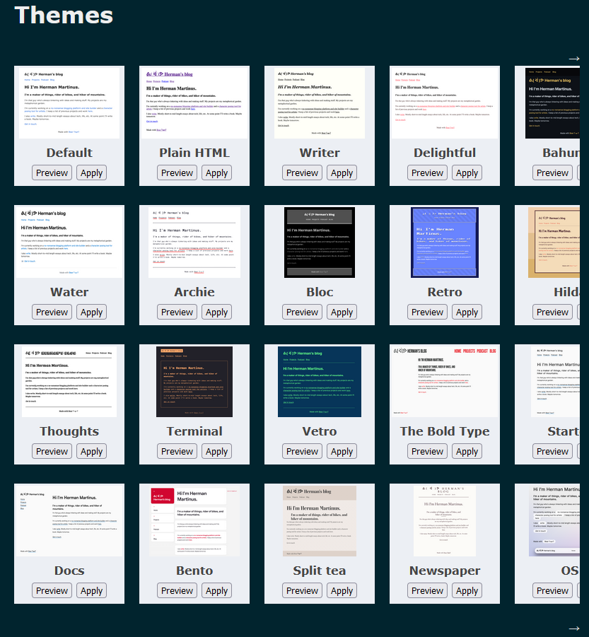 While these are all publicly-available platforms that anyone can create an account for, you can also self-host your own blog and not have to worry about any subscriptions or Google tracking. Personally, I use Jekyll, which is a more complex library using the Ruby programming language that generates a blog website you can host on your own server, or a static server host like GitHub or Cloudflare pages. It uses Markdown like Bearblog, but I just edit it in a regular code editor on my computer. WordPress is also an insanely popular one used to host a good chunk of blogs such as Cabel's blog and I believe also has a visual editor like that of Blogger. I've also heard very good things about Ghost, but I haven't tried it myself.