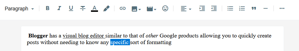 Blogger has a visual blog editor similar to that of other Google products allowing you to quickly create posts without needing to know any specific sort of formatting